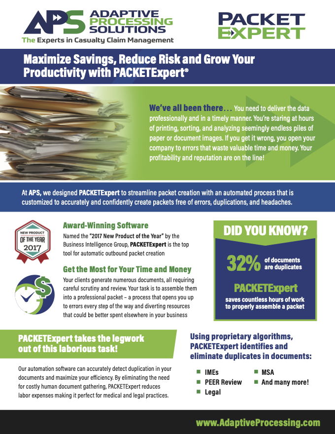 With our Clearinghouse solution, Payments services, Digital Mailroom (centralized document intake), Print and Mail solution, and AP Capture platform, along with our document services, Bill Review and Negotiation, and our claims processing product, APS truly takes the claims management process from inception to resolution.